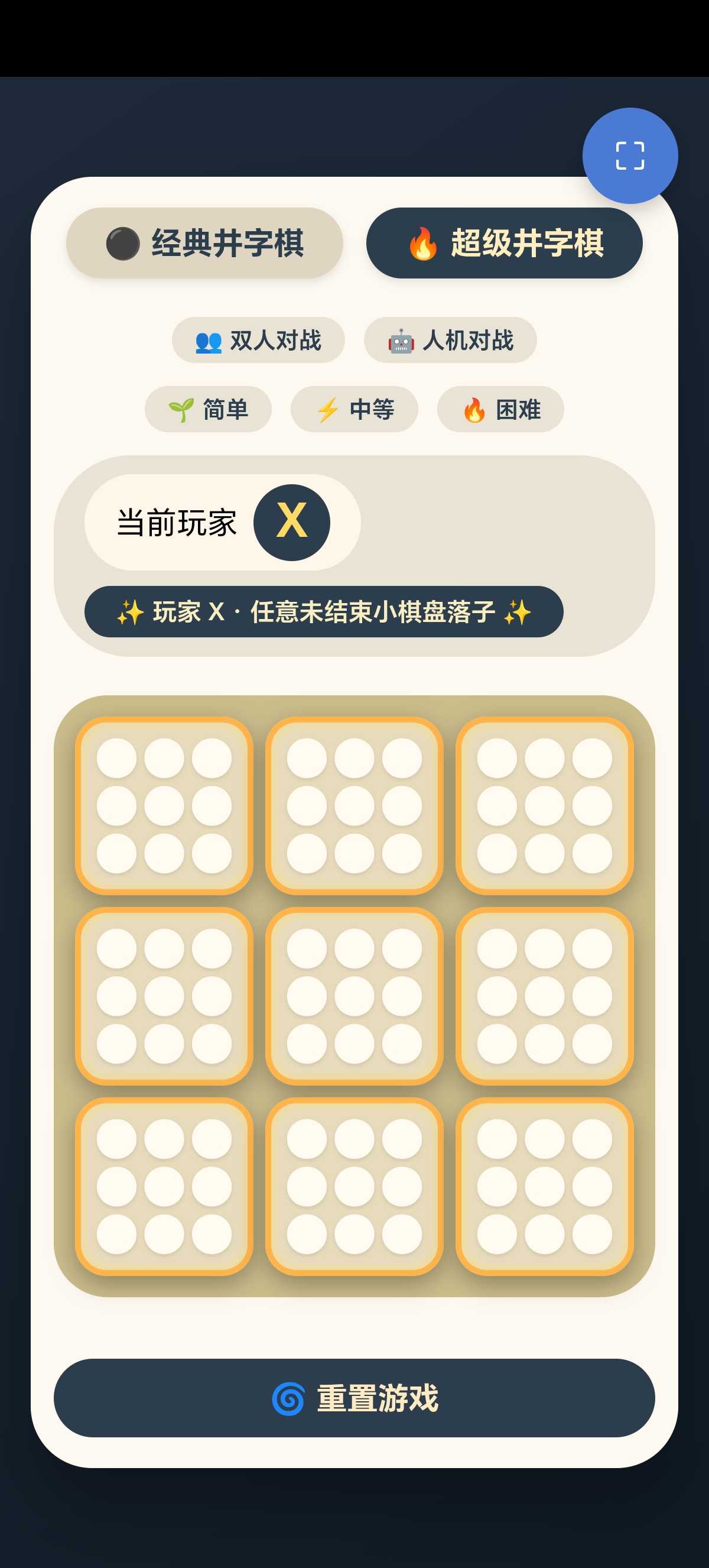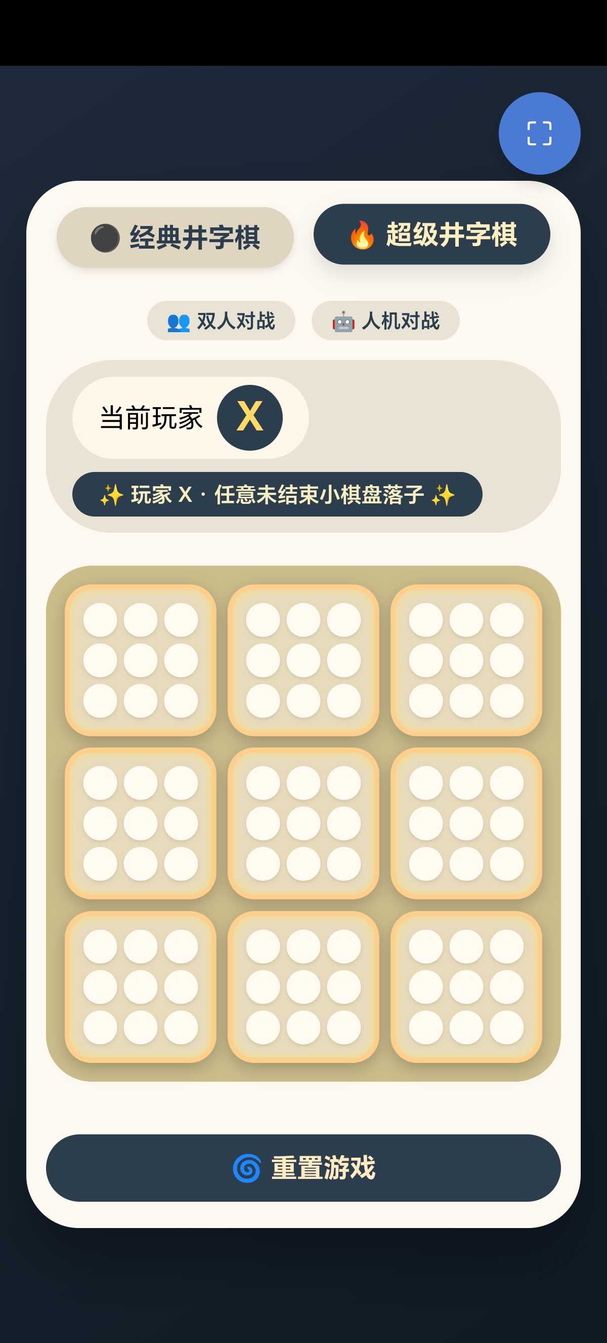 本游戏系本人使用千问ai和deepseek制作,遵循CC BY-ⓃⒸ-SA(署名-非商业-相同方式共享)3.0知识共享协议发布。 内涵普通井字棋和超级井字棋,以后会加局域网联机,有什么意见敬请提出。