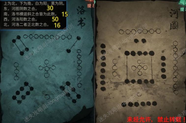 13、“切换视角”至女主,点击【机巧阁】右下边龙头的阴阳块,女主这左边石门打开,【千书斋】墙上左边【洛书】截图下来,点击左下角柜子,按照刚才书里线索,如下图,结合【河图】【洛书】算出北16南15西50东30,打开得到【猴子雕像2】【六转妙法录】;13