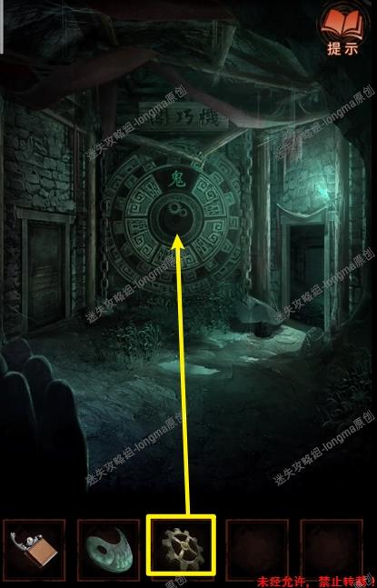 3、来到【尸解居】,点击右边墙上转盘,目的是要把石块全部变亮,石块亮的位置不唯一,一个石块可能在好几个位置都可以亮,这里需要穷举一个个测试(也可能是跟墓碑那六道有关系),最后如下图所示,全亮后得到【轮状零件】;3