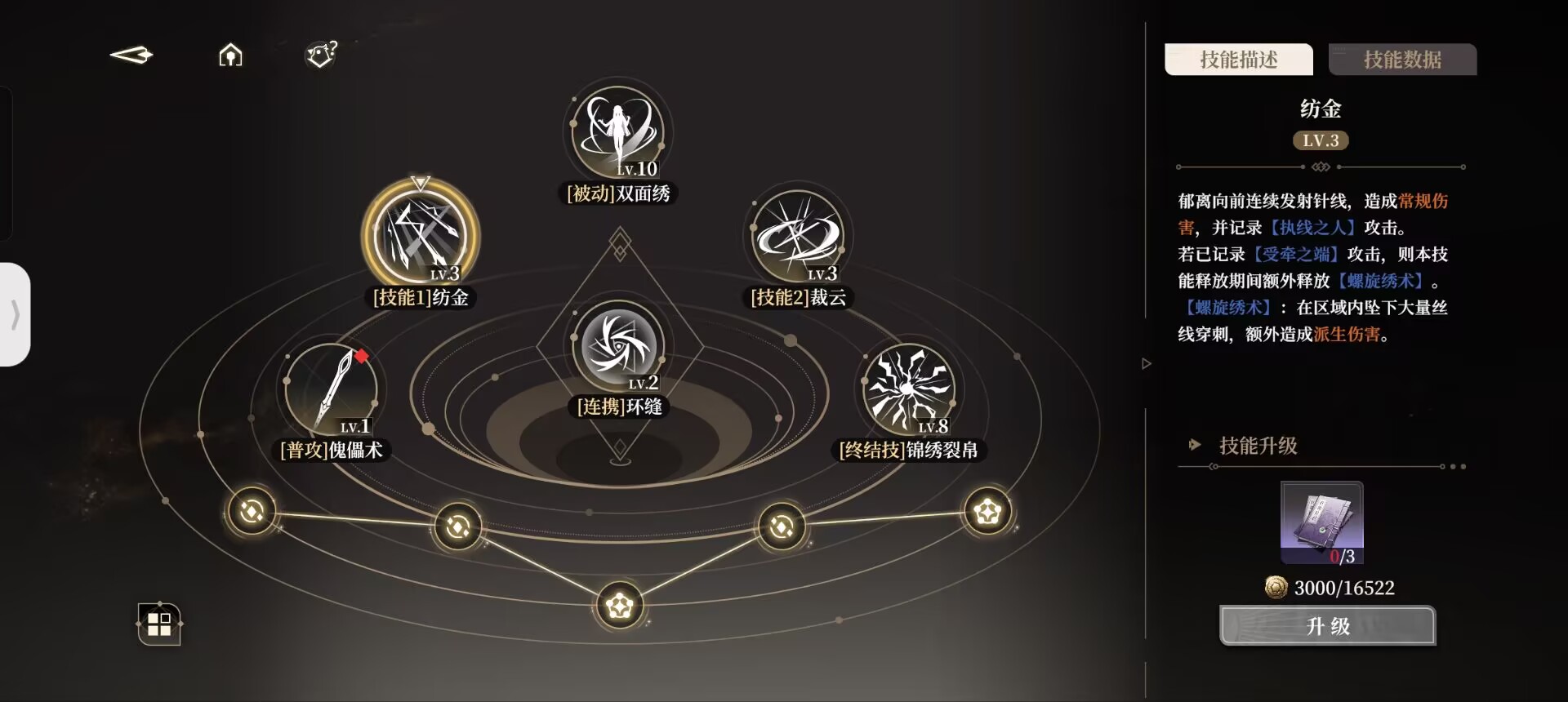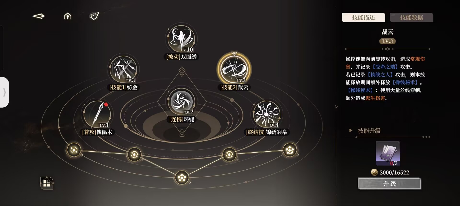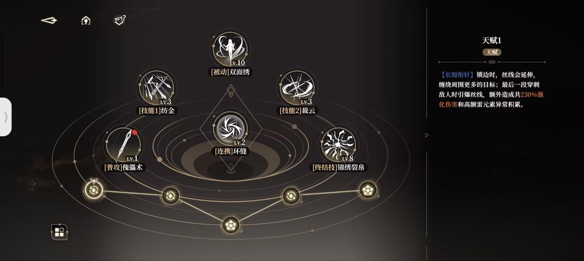 我们在使用过一技能后,会持有小郁离的印记,即【执线之人】。此时二技能则会转变为被动中的【操纵秘术】。同理,我们在使用过二技能以后,便会持有傀儡即大郁离的印记,即【受牵之端】,此后使用的一技能则会变为【螺旋绣术】。