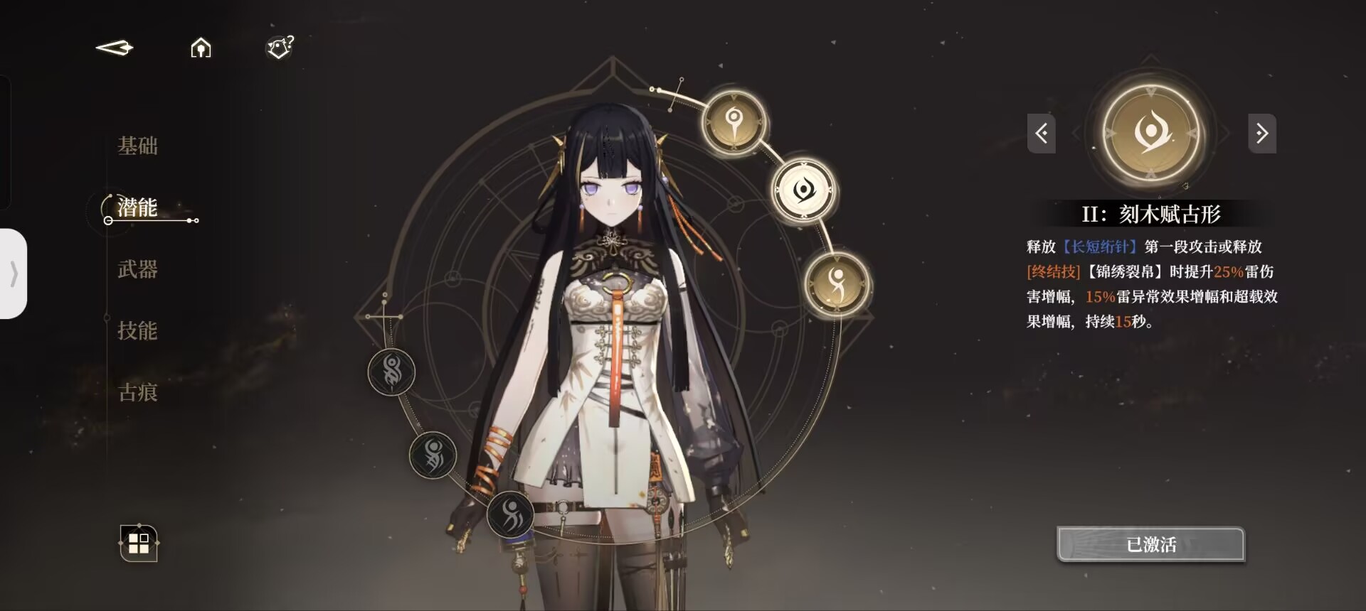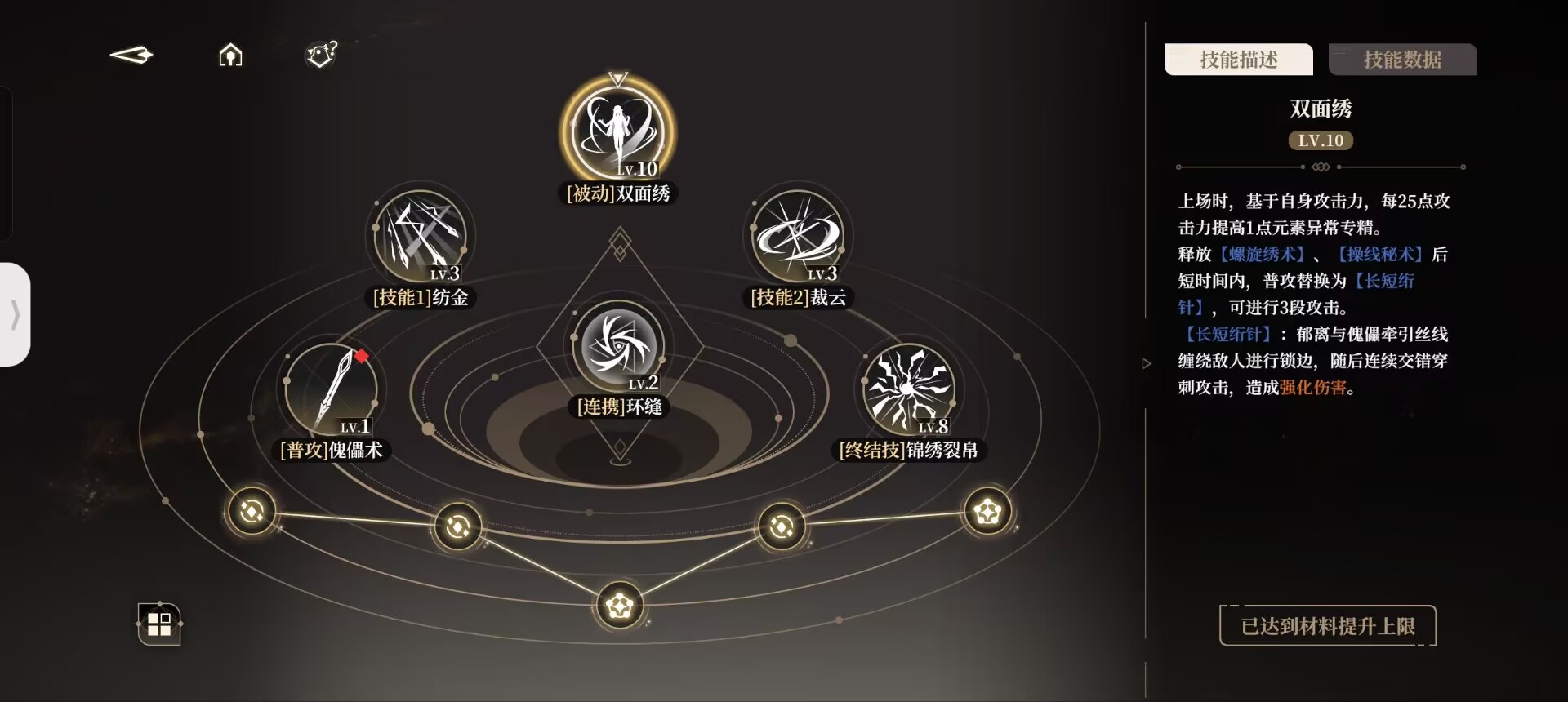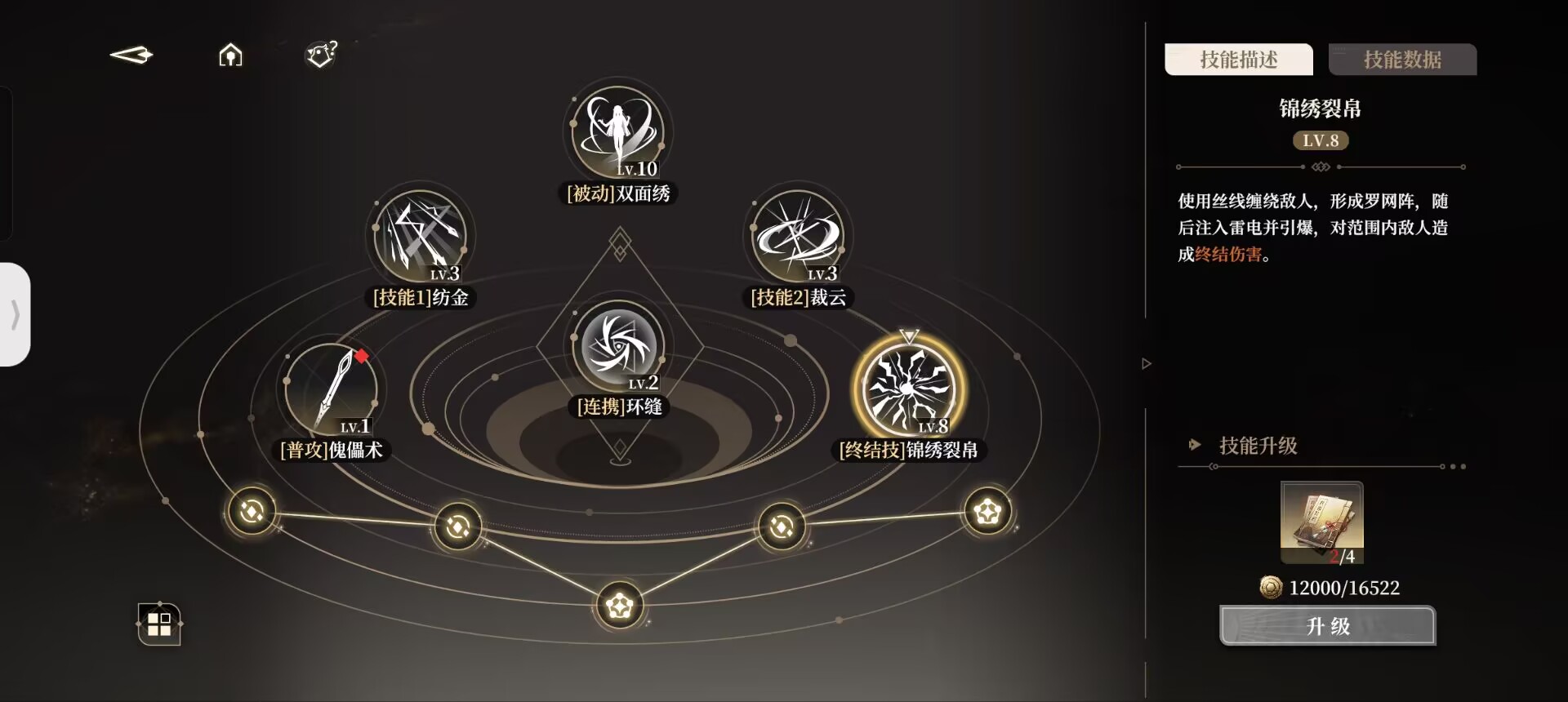 我们在使用过一技能后,会持有小郁离的印记,即【执线之人】。此时二技能则会转变为被动中的【操纵秘术】。同理,我们在使用过二技能以后,便会持有傀儡即大郁离的印记,即【受牵之端】,此后使用的一技能则会变为【螺旋绣术】。