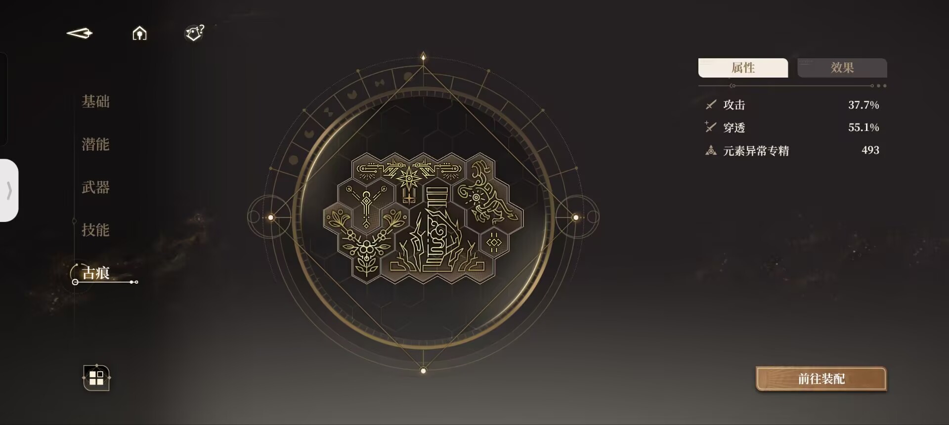 郁离古痕可选为(词条均为攻击,穿透,元素异常):专属(无尽)+沙上+金枝(忘川)+老虎(玉鹤)。此处也可以换掉沙上,上老虎带玉鹤。个人推荐专属沙上金枝老虎。