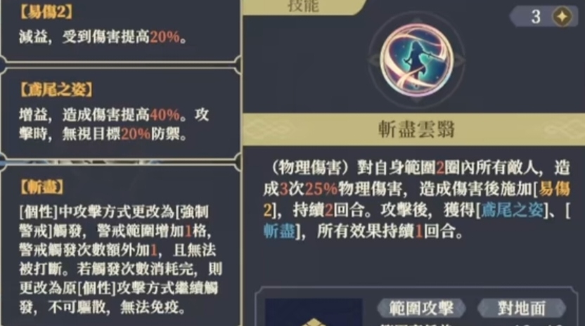 斩尽云翳是莉拉的终极技能。对自身范围二圈内的所有敌人造成3次25%的伤害,并施加易伤2,攻击后获得鸢尾之姿、斩翳(主要作用是将个性效果变成强制警戒,次数消耗完后,变回个性攻击方式继续触发)