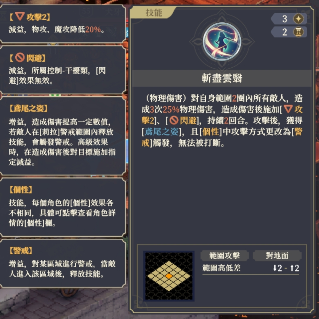 【斩尽云翳】技能介绍看是一个aoe的搅屎棍技能,降低攻击,禁止闪避。该技能还会触发个性,虽然目前不知道个性是什么,但是根据手头的资料推测应该跟警戒相关。