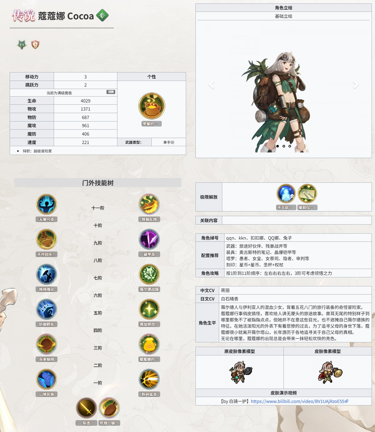4. 在角色页面,新增了角色英文名、角色绰号、中日文声优和角色生平的模块,以便新玩家熟悉不同的角色。新增了角色皮肤像素模型的对比图,同时附带了b站up主白骑一护制作精良的皮肤对比视频。补全/更新了一版所有传说角色的技能加点&配置推荐(从爱莎开始的角色页面收录了超能缪缪制作的对应角色攻略,一些较老的角色评价和推荐则收录到了首页“神秘物品”模块)
