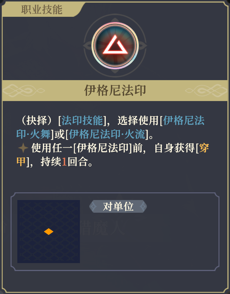 ——会与四星以上杰洛特的个性产生联动,对范围内的目标[▼物防];也会与【伊格尼法印】产生联动,对目标附加魔法伤害。