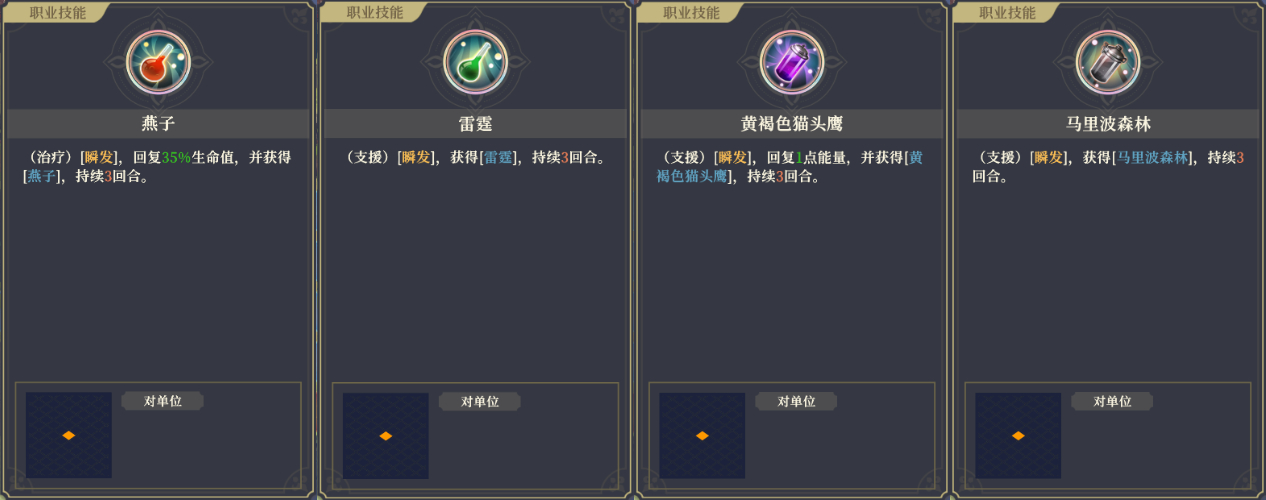 可瞬发使用的技能,选择性提高自身物攻、暴击率、回复能量或生命。