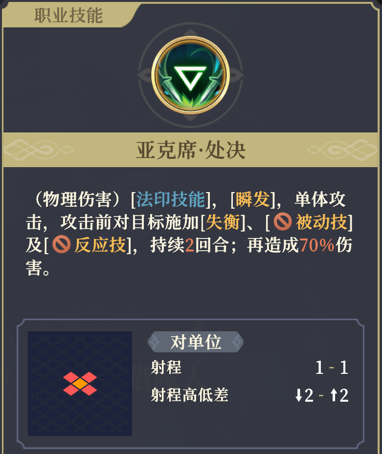 杰洛特唯一能施加定身效果的技能,能自助触发领袖光环的额外增伤效果。但总的来说,该技能只能打单体、倍率不高而且定身带来的额外增伤不够高,因此实战中一般会带别的法印技能来增伤,该技能一般只做对策使用(比如说需要打控制,又比如说这招可以吃到SP索菲亚的强袭指令和霍玛的鸟)。