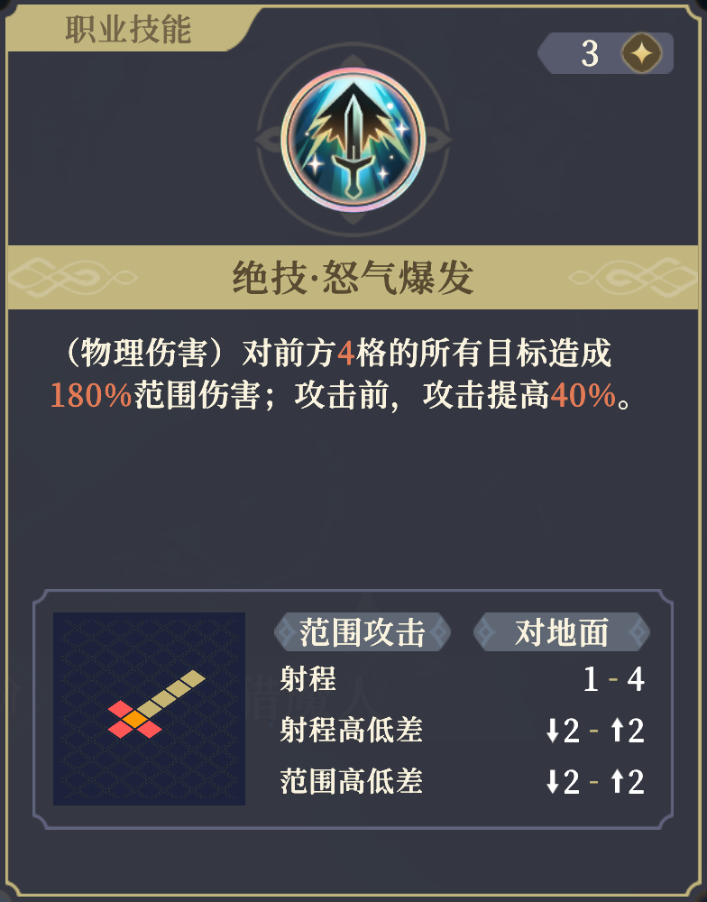 对直线敌人造成高额伤害,攻击前自身攻击额外提高。