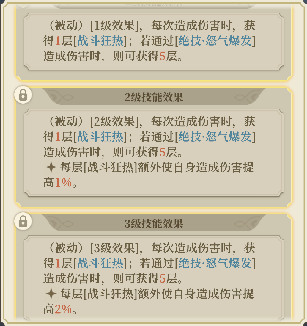 每次造成伤害后自身获得[战斗狂热],并基于[战斗狂热]提高自身伤害。