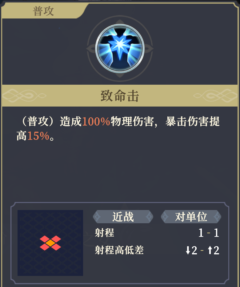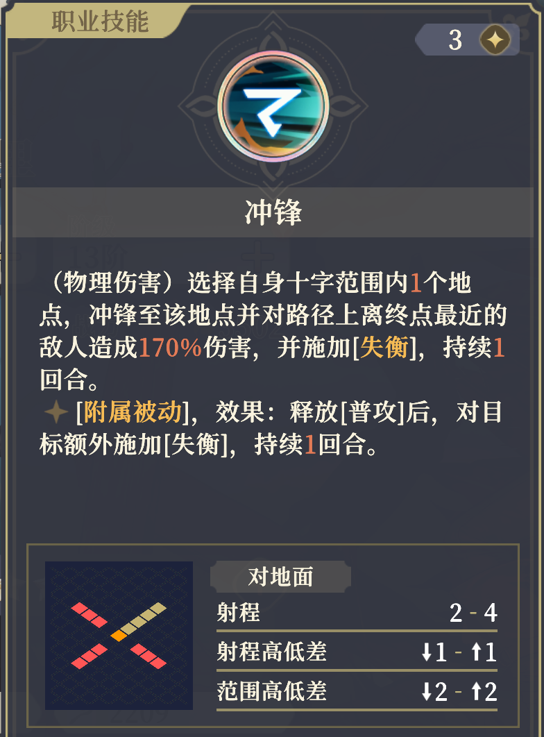 ,造成170%伤害并施加[失衡]。其中的“冲锋”,无视阻挡,且可跨越障碍物与沟壑;其中的“主动单体攻击”,可以吃到背击增伤与高地加攻,可以被格挡,但是无法触发[强袭指令]和霍玛的鸟。