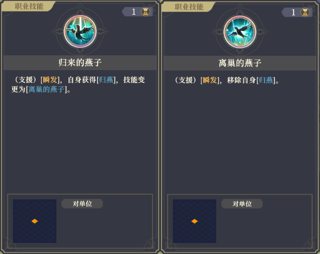 瞬发技能,使用后获得[归燕],效果:物理攻击后降低目标速度,行动结束时传回队友身边,并回复生命与能量。使用后,技能转换为“离巢的燕子”。