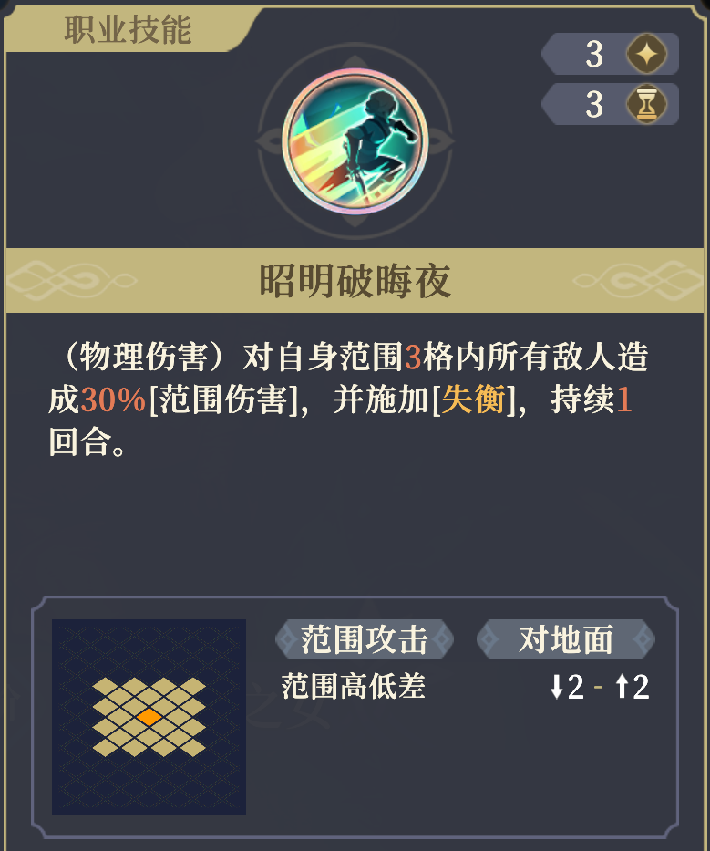 对周围随机敌人造成范围伤害,命中的人数越少则伤害越高;攻击具有定身效果的敌人时,自身攻击大幅提高。