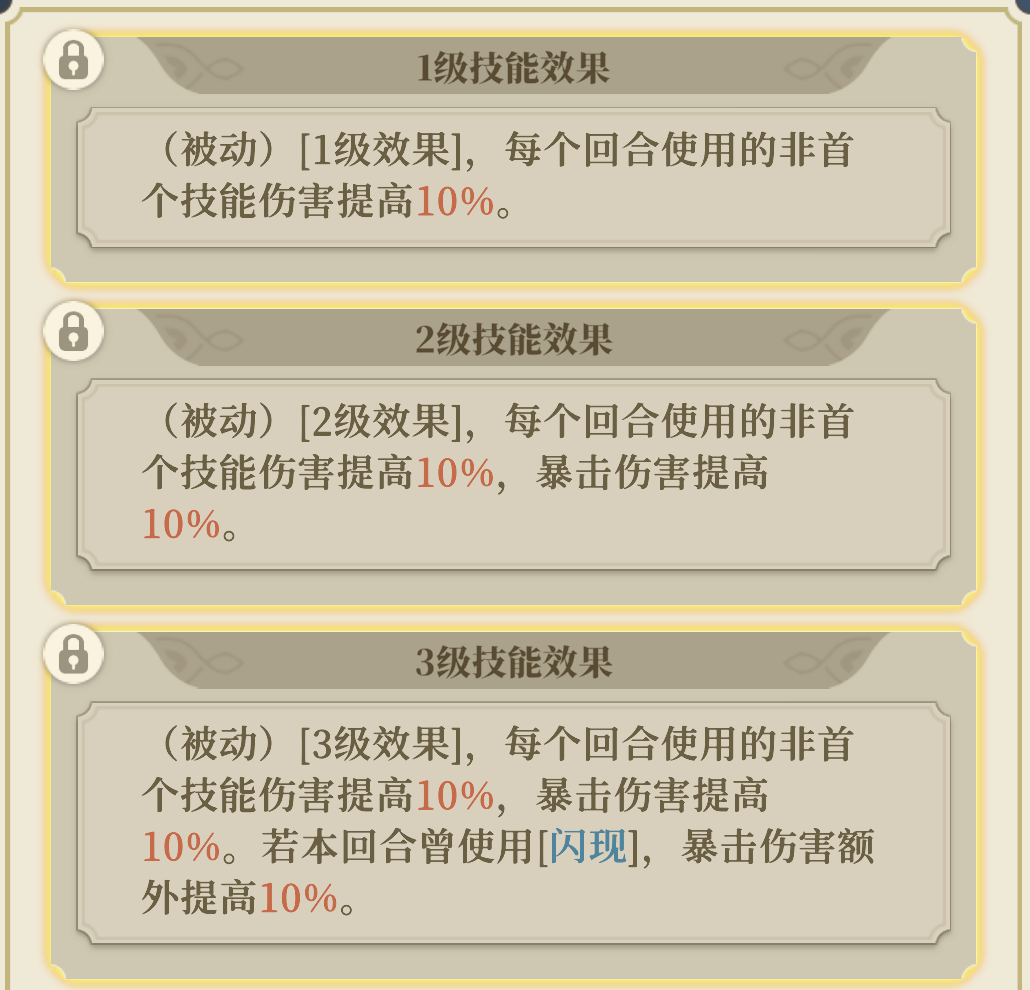 回合内使用非首个技能时伤害、暴击伤害提高;使用[闪现]后,自身暴击伤害额外提高。