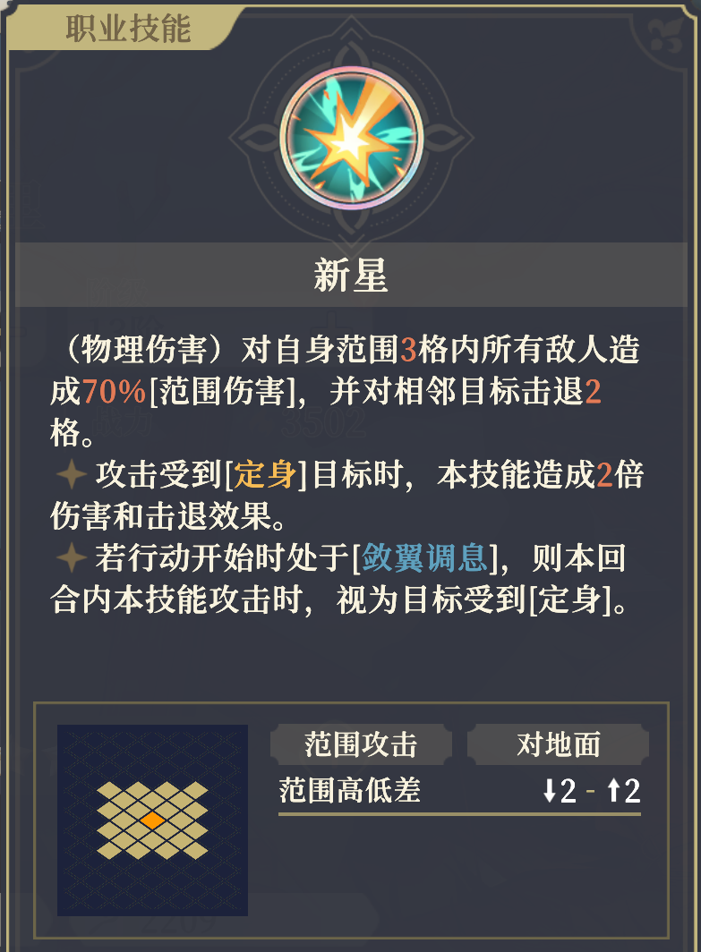 ✦ 技能为[新星]时,则额外击退2格(本条3星获取),造成伤害额外提高25%(本条5星获取)。