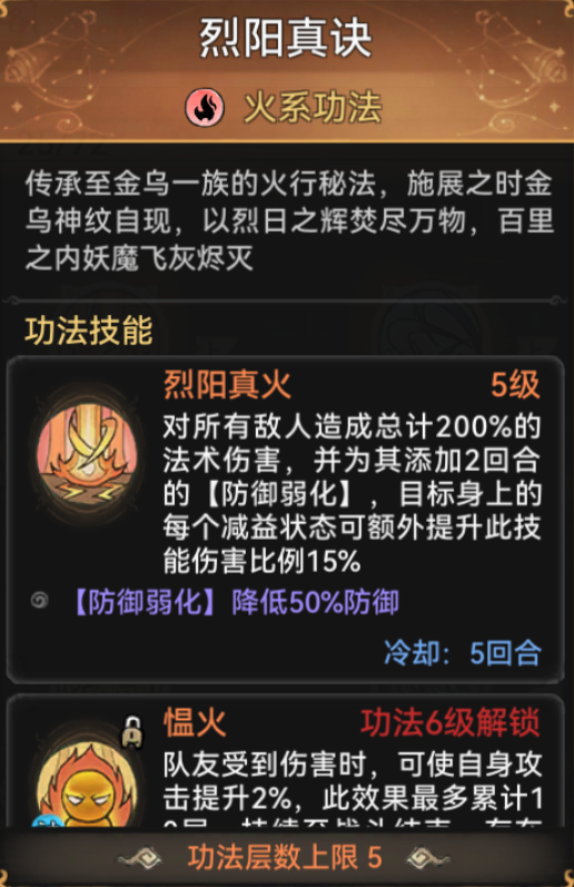 在锁妖塔中还有一本输出功法中后期十分强大,那就是传说中金乌一族的火行秘法烈阳真诀。烈阳真诀不仅有着高昂的群体输出,而且每有一个减益状态在目标身上,就能额外提升15%的伤害。如果配合灵祭咒录,那威力将是毁天灭地级别的。