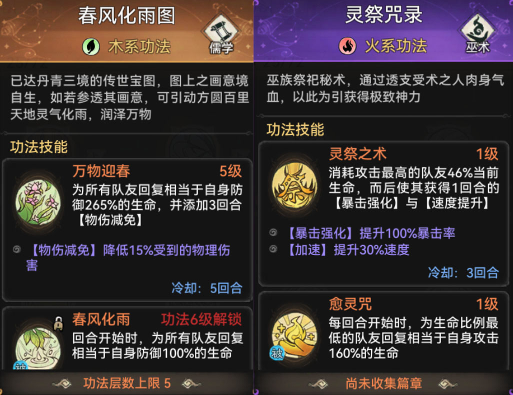 当来到中后期时,大部分前期的治疗功法奶量可能就显得有些不足了,这个时候祖师老爷可能需要锁妖塔中的功法春风化雨图,这个功法能以265%的防御值恢复生命,同时还能为队友提供3回合的物伤减免。和奶量相对的,中后期输出比较匮乏的时候,就需要辅助类型的功法灵祭咒录进行增益了,虽然说会消耗将近一半的生命,但换来的暴击强化与速度提升是无可比拟的。