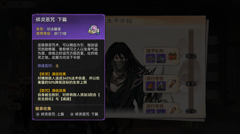 功法升级每次获得新的功法后会自动放入藏经阁,并且可以获得对应的灵玉。但,再强的绝世功法,不研习也是没有意义的。只有获得了完整的功法后才能进行研习,使用重复的篇章或者无字天书研习功法可使功法获得属性增益以及技能强化,而且弟子无需装备功法也能提升属性。