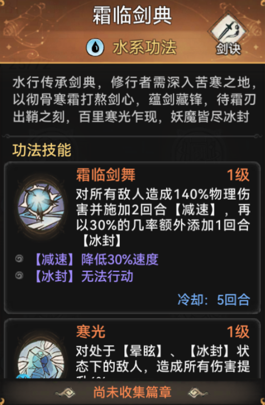 虽然前面所介绍的功法都十分强大,但如果施展不出来,那该怎么办?在前期还有一个优秀的功法叫霜临剑典,十分适合给辅助弟子,造成物理伤害的同时还能施加2回合减速,还能以30%的概率将对方冰封,让对方无法行动。