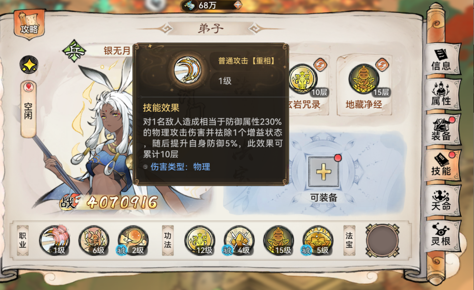 技能解读:从技能上来看,银无月拥有者普攻变为防御加成,在配合守护反击能使银无月打出不俗的伤害。而且其自身拥有高额的防御加成,反击增伤,独有的守护机制,比起普通兵修能更好的保护后排,还能打出更高的伤害。其被动拥有兵修的攻击转防,还比普通兵修多一个净化与治疗。主武器推荐带剑能更好的配合被动。加上四灵根使她有更多的功法选择,让五行塔也能无脑的上银无月。