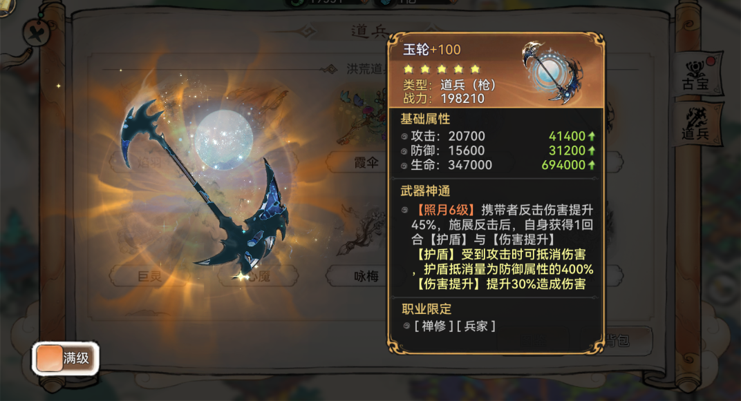 玉轮:反击伤害增加,反击就能加盾,使银无月又有伤害又有肉。