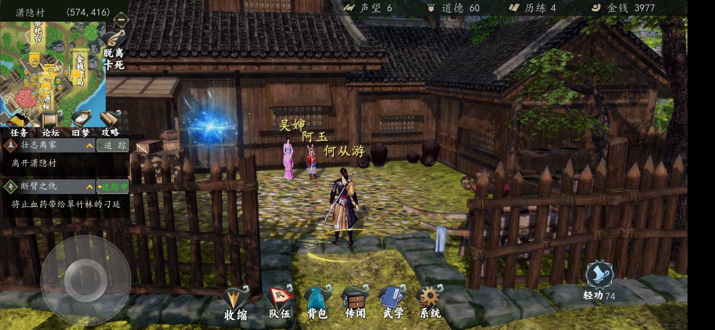 接下来折返去垂钓点,三个任务线索全在这,拿完草药打混混,司晚晴直接用金疮药救,救完后魏天啸就会来送你一本武功图谱,别忘记最后再点一下司晚晴还任务,战斗全程托管不碍事。
